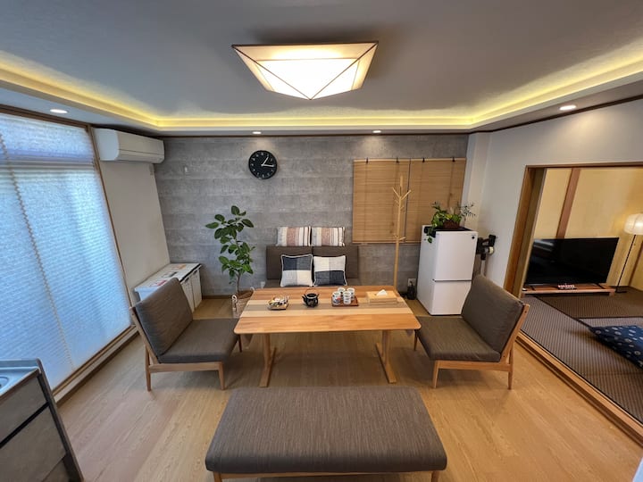 Sewa seluruh rumah|3 menit berjalan kaki dari stasiun kereta bawah tanah|Akses mudah ke Bandara Kansai dan Shinsaibashi|Ruang yang luas untuk menampung hingga 11 orang|Ideal untuk perjalanan keluarga dan grup