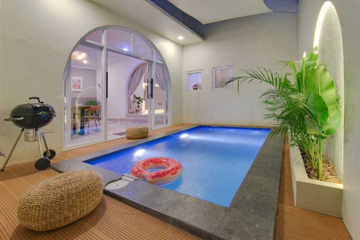 3 menit naik bus/BBQ, api unggun/pemandian air panas alami, sauna, kolam air, home theater/BBQ dan api unggun dapat dinikmati meskipun hujan