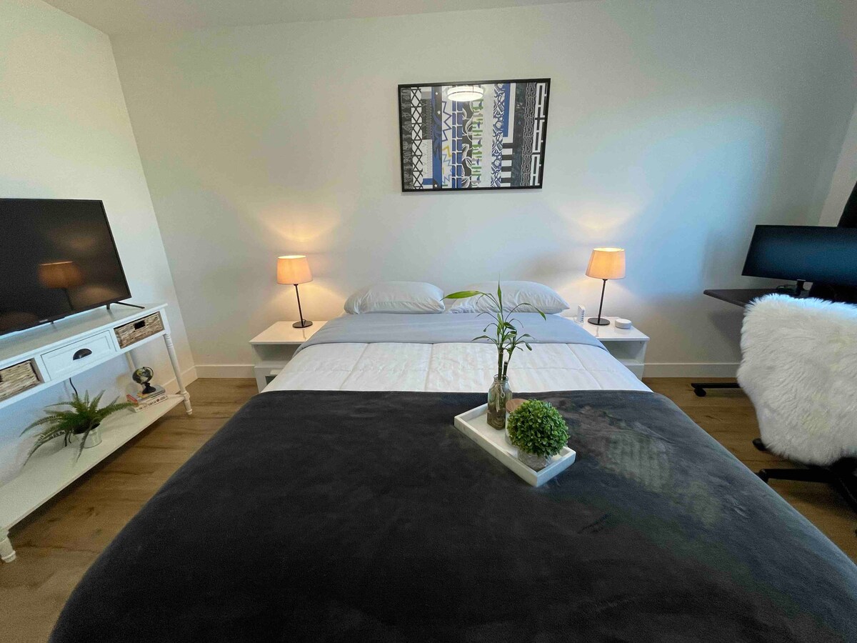 Lupakan kekhawatiran Anda di tempat yang luas dan tenang ini. Berfasilitas lengkap agar masa menginap Anda bebas dari kekhawatiran. Privasi penuh, tidak ada area umum, pintu masuk sendiri, kamar mandi pribadi lengkap, dan area teras. Kamar tidur utama yang luas, tempat tidur queen, tempat tidur sofa untuk tamu ketiga, tirai yang gelap untuk privasi penuh dan istirahat yang menyenangkan. Microwave, kulkas, pemanggang roti, meja makan, TV dengan HULU, kopi Keuring, setrika, papan setrika, Handuk, seprai, sampo, kondisioner, sabun mandi. AC dan Pemanas Pusat. Peraturan rumah Jam tenang 11p ke 6a