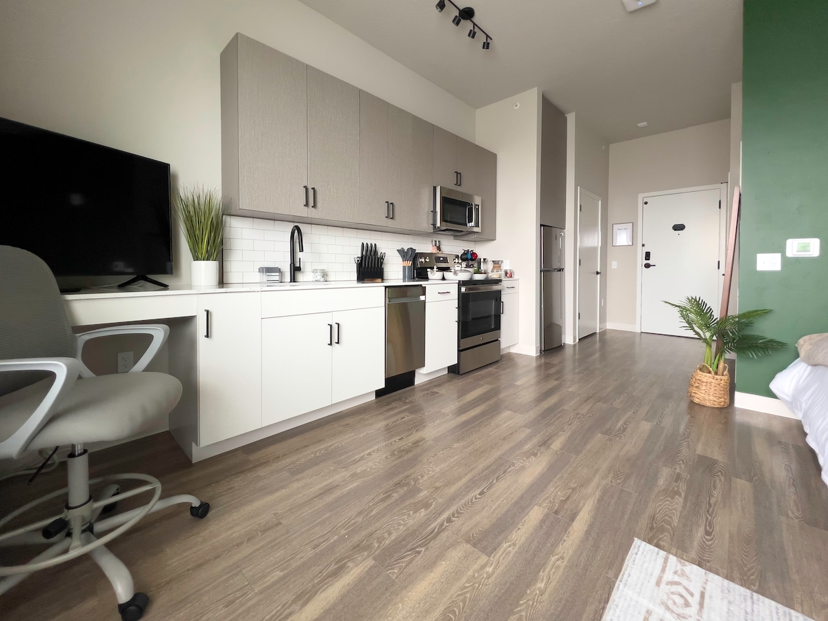 ❤️ Sebelum Anda lupa — ketuk Simpan untuk ❤️ permata Boise ini untuk lain waktu! Rasakan kemewahan di King Bed Studio Cloud Stays, berlokasi ideal di dekat pusat kota, St. Luke's, Julia Davis Park, BSU, dan tempat makan dan berbelanja terbaik di Boise. Nikmati fasilitas premium seperti bar kopi, ruang kerja bersama, kolam renang bergaya resor, dan dek atap dengan pemandangan cakrawala. Whole Foods berada di sebelah, termasuk tempat parkir yang aman, dan setiap detail memastikan kenyamanan dan gaya untuk masa inap yang santai dan berkesan di pusat kota Boise.