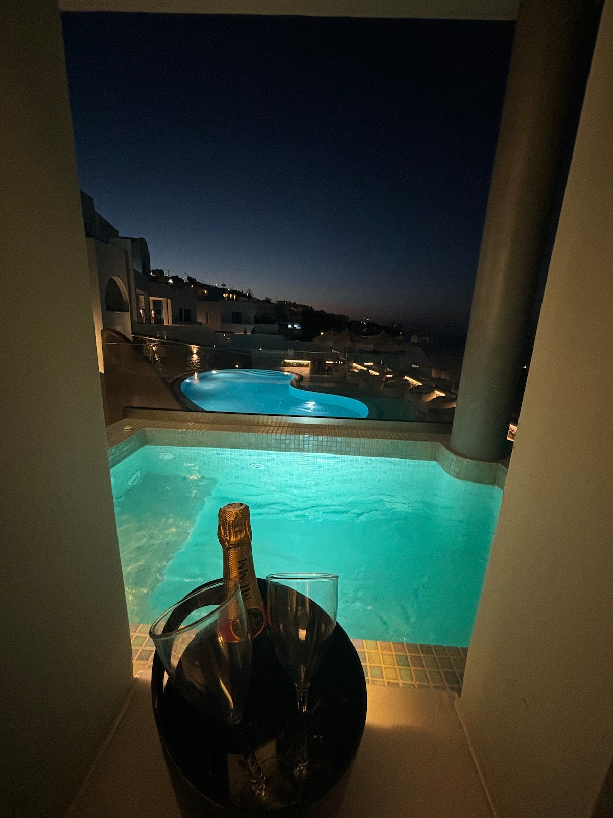 Junior Caldera Sea & Sunset View terletak di BAGIAN ATAS pelek kaldera di Imerovigli yang menghadap ke laut (Laut Aegean), Kaldera yang terkenal, Gunung Berapi, Kepulauan Cycladic lainnya di dekatnya, dan Sunset yang terkenal. Tempat ini memiliki Jacuzzi/kolam renang mini/bak mandi jet air panas luar ruangan untuk 2 orang dan tidak dapat mengakomodasi anak - anak di bawah 4 tahun.
