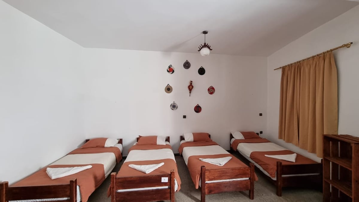 Clementine Suite is perfect for a family stay. It has a huge matrimonial bed and two single beds. The windows overlook on the Cathedral point with its famous surf spots and Imsouane bay from the other side. Downstairs there is an equipped shared kitchen accessible for all our guests, and on the top we have a panoramic terrace with an area with some sofa to hang out. We serve breakfasts from 8 AM until 10:30 AM and it's included in the price.