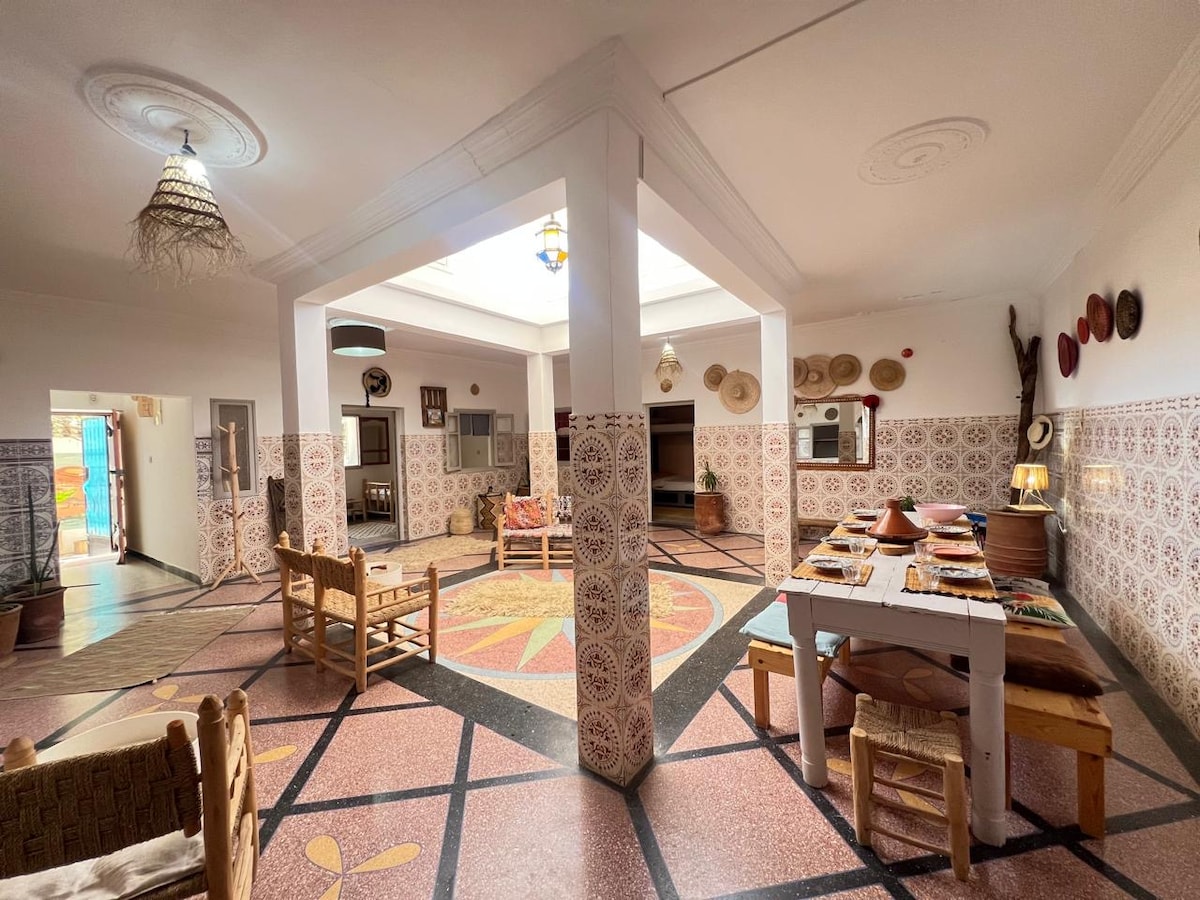 Riad berdiri tinggi yang megah dengan kolam renang kecil, jacuzzi (3 * 4m). menawarkan pemandangan laut yang tidak terhalang. Terdiri dari 4 suite, teras, dapur dengan perlengkapan terbuka ke ruang tamu besar. TV generasi terbaru terhubung, Netflix, YouTube. Terletak di area yang tenang dan aman dan dekat dengan toko - toko kecil, pantai, golf, souk el Had yang besar, kafe dan restoran, pusat relaksasi. Ideal untuk liburan bersama keluarga atau teman. Transfer bandara 24/24 atas permintaan.