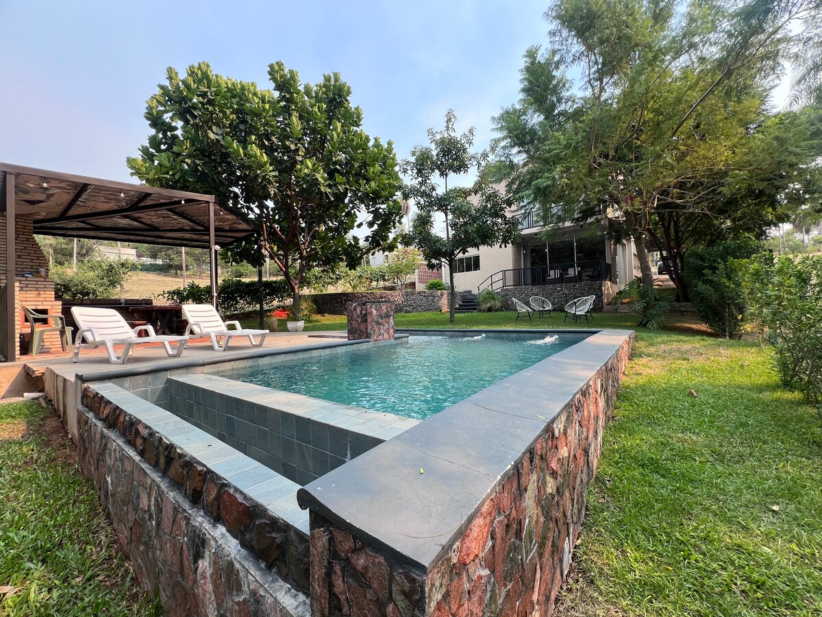 Bersantai bersama seluruh keluarga di tempat tenang seluas 4 hektar ini untuk menginap dan bersentuhan dengan alam. Rumah ini memiliki kolam renang , pemanggang , teras besar dengan taman. Tertutup , piring ,anafe , blender , oven listrik, mixer, dan dolce gusto coffee maker. Seprai , dan bantal untuk setiap tempat tidur. Handuk untuk semua tamu. 3 menit ke minimarket Biggie dan 5 menit ke supermarket Superseis. Tentang rute Sanber Altos. Meter dari Restaurante Tatano.