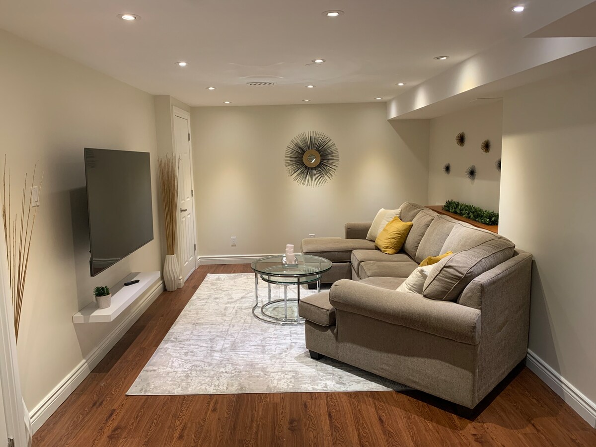Legal Basement - Tempat modis ini nyaman menampung hingga 5 tamu dan dilengkapi perabotan lengkap. Terdapat 2 kamar tidur, masing - masing menampung 2 tamu, beserta daybed di ruang tamu untuk orang ke -5. Satu kamar tidur menawarkan tempat tidur queen size, sementara kamar tidur lainnya memiliki tempat tidur double size. Selain itu, ada 2 meja belajar dengan kursi, satu di setiap kamar tidur dan satu di ruang tamu. Dapur yang dirancang dengan cermat ini menawarkan sentuhan modern dan mewah. Kamar mandi bergaya ini dilengkapi pancuran berdiri.
