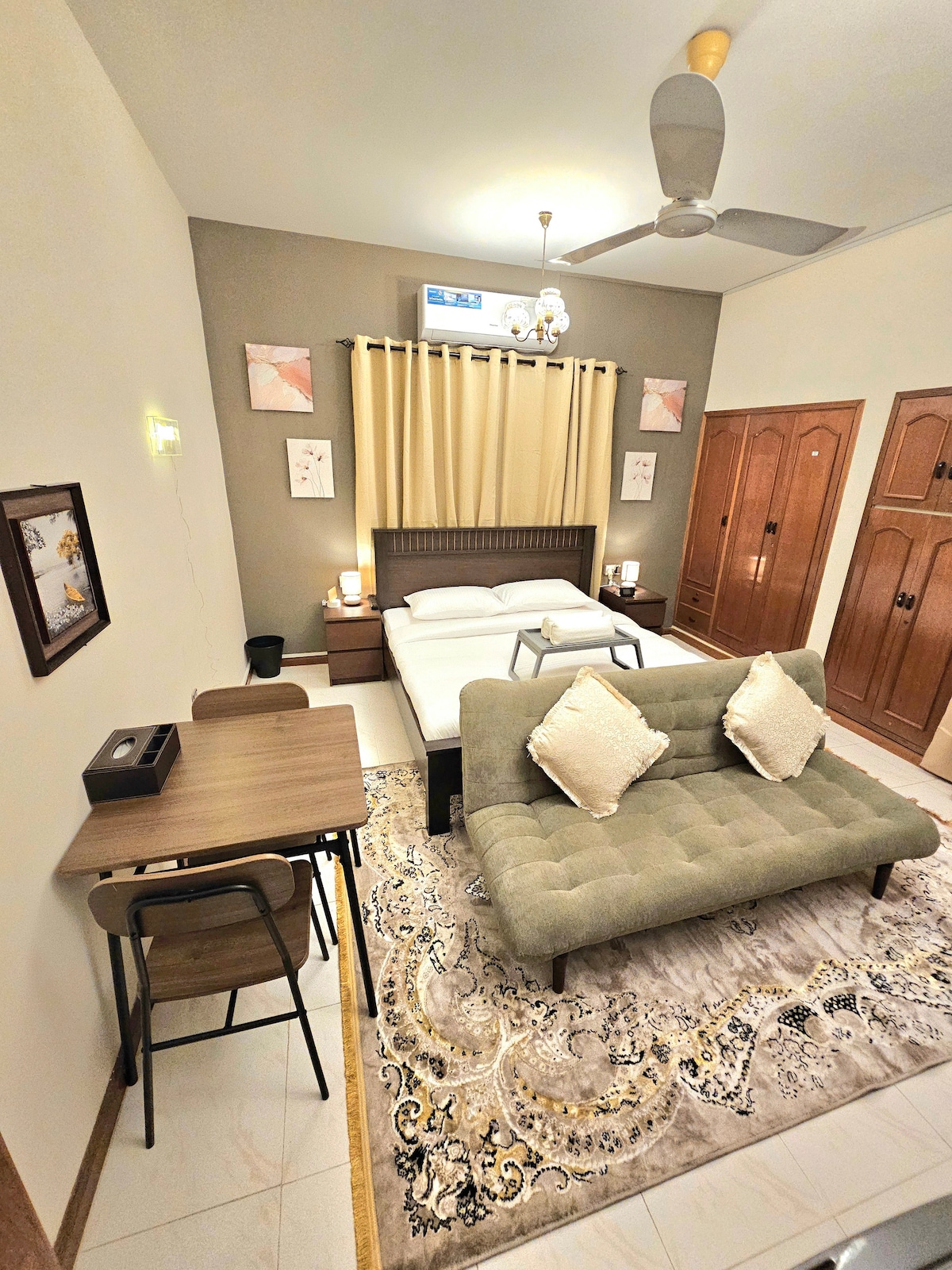 Bersantai bersama keluarga atau Teman Anda di tempat yang damai ini. Lokasinya di Sharjah uae. 24/7 Oprating Groceries stores are few steps away. Central Market berjarak 10 menit berjalan kaki. Beberapa slot parkir mobil tersedia 24/7 untuk Tamu. Taman luar ruangan tempat Anda bisa bersantai di Udara segar. Kami memiliki AC Individu di setiap kamar. internet berkecepatan tinggi untuk bekerja jarak jauh. Perhatian: kami hanya mengizinkan wisatawan atau keluarga untuk menginap di sini, jangan memesan tempat ini untuk tujuan kencan atau kencan.