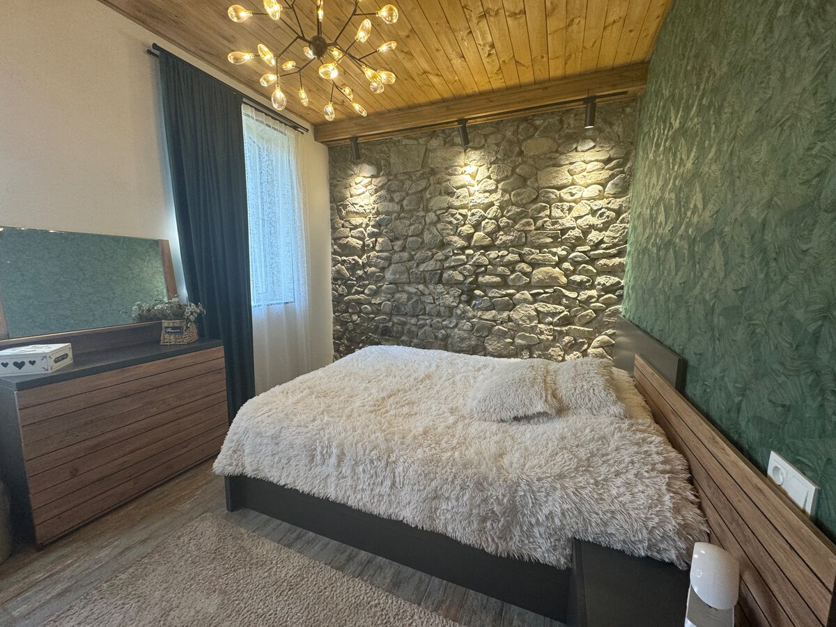 Selamat datang di Borjomi! Apartemen 🌿 kami berlokasi di distrik hijau yang tenang, menawarkan pemandangan kota dan pegunungan yang menakjubkan. Udara pegunungan yang segar membuatnya tetap sejuk di musim panas, sementara perapian yang nyaman menciptakan kehangatan di musim dingin. Bersantai di balkon, nikmati lingkungan yang tenang, atau biarkan anak-anak bermain di halaman kecil. Apartemen ini memiliki ruang tamu yang luas dengan AC, kamar tidur terpisah dengan tempat tidur king, dapur lengkap dengan kompor listrik, area makan, kamar mandi, tempat parkir, dan garasi.