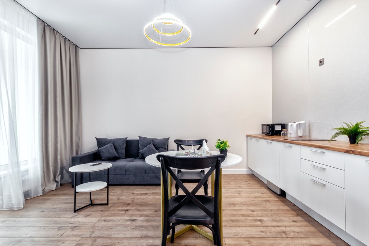 Bersantailah dan bersantai di tempat yang tenang dan bergaya ini. Apartemen modern dengan renovasi desainer dan suasana penuh perhatian. Kamar tidur yang luas dengan tempat tidur yang nyaman dan tirai blackout, kamar mandi bergaya dengan ubin marmer dan mesin cuci, dapur yang nyaman dengan area bar dan peralatan modern. Cermin berlampu belakang besar dan aksen kayu hangat menciptakan nuansa nyaman. Lokasi yang bagus dekat dengan restoran, toko, dan transportasi — sangat cocok untuk beristirahat dan bekerja.