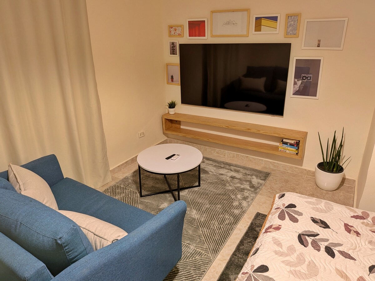 Studio lantai dasar yang menawan ini menawarkan perpaduan sempurna antara kenyamanan dan gaya, Terletak di Jalan Al Taqa, studio ini hanya berjarak 5 menit dari Ahly Club, 8 menit dari Universitas Al - Azhar, dan 15 menit dari Bandara Kairo, menawarkan kenyamanan dan aksesibilitas ke lokasi utama di kota. Fasilitas modern ada di ujung jari Anda, termasuk smart TV untuk hiburan, kulkas dan kompor untuk persiapan makan, serta WiFi dan AC berkecepatan tinggi untuk memastikan kenyamanan selama Anda menginap.