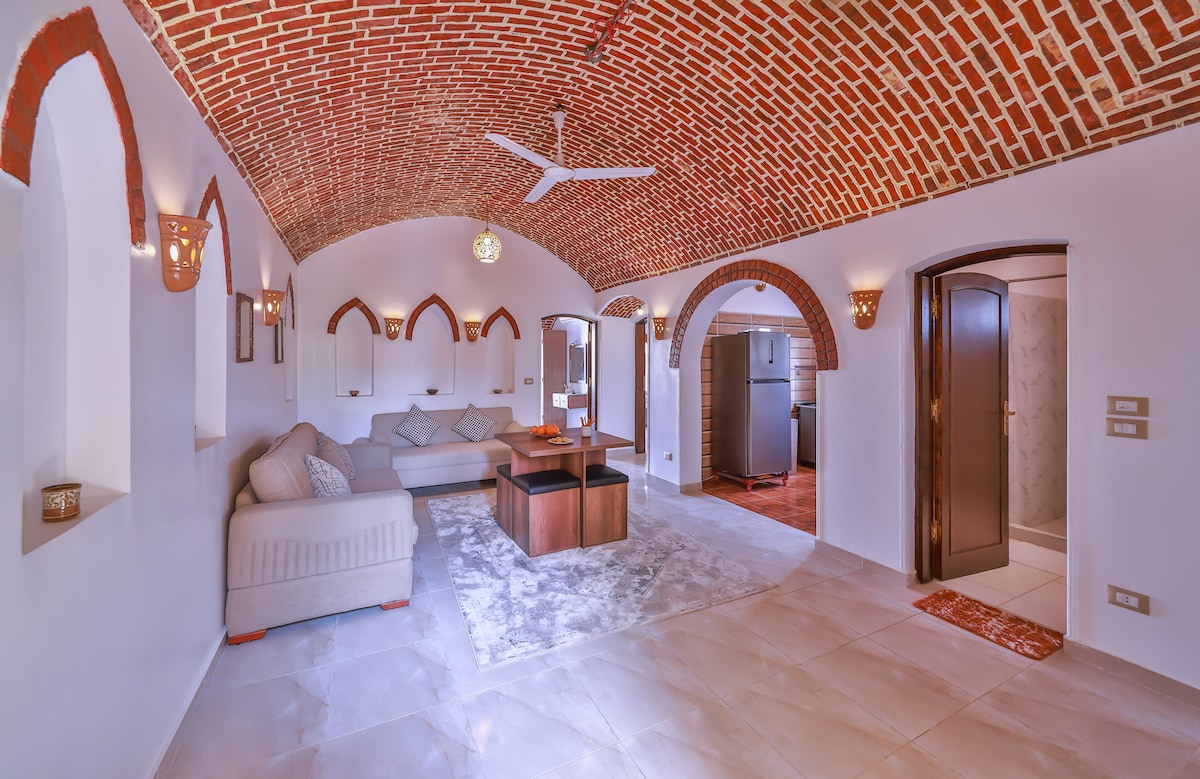 Mencari kedamaian? Terletak di tepi desa yang tenang di Tepi Barat Luxor, seluruh apartemen lantai dasar ini di rumah bergaya Arab tradisional dengan langit - langit bata berkubah dapat menampung empat orang. Ruang tamu yang besar dipenuhi dengan karya seni asli oleh pemiliknya dan masing - masing kamar tidur yang luas memiliki kamar mandi sendiri. Bersantai di dua taman nyaman dengan air mancur di bagian depan dan belakang rumah, yang terletak dekat dengan Sungai Nil, barang antik dan semua fasilitas.