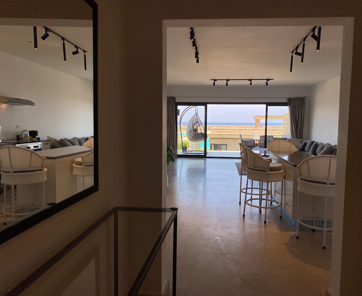 Chalet atap 2 kamar tidur yang indah dan nyaman di lantai dua (EXTENSION of Stella Sidi Abdelrahman) dengan kolam renang dan pemandangan taman, juga memiliki teras besar yang memiliki pemanggang bbq dan pergola dengan meja dan kursi di bawahnya. Supermarket (Dreams) benar - benar dekat yang memiliki semua yang Anda butuhkan sebelum Anda pergi ke pantai atau makan malam di tempat Anda. Chalet ini dilengkapi dengan segala kebutuhan Anda dan sangat bersih dan nyaman dengan AC di kedua kamar. Pemandangan dari teras sangat menakjubkan.