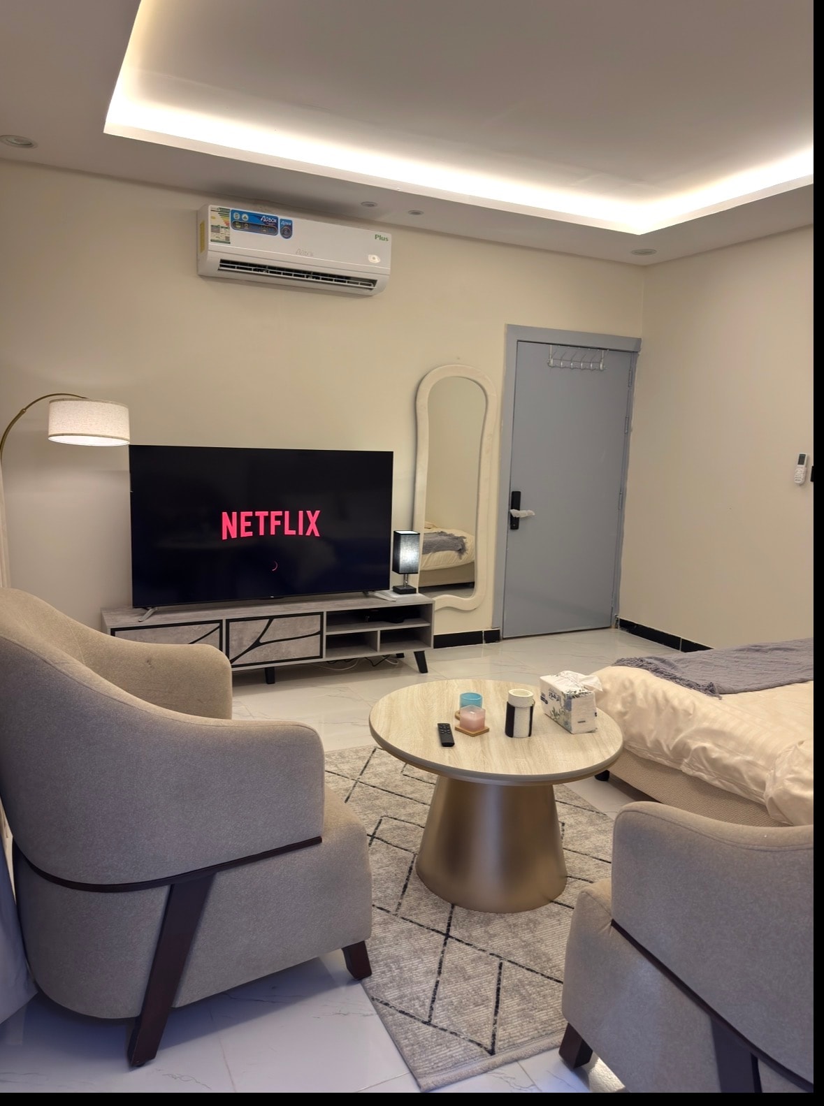 Apartemen satu kamar tidur dengan tempat tidur utama dan ruang tamu Baru dibangun dan dilengkapi perabotan Ini menambah pengalaman yang nyaman dan khas bagi tamu Terletak di tengah Muzahmiya dan di belakang pusat perbelanjaan terbesar di kota ini Mezahmiyah Mall Dekat dengan semua layanan, parkir teduh gratis Internet Berkecepatan Tinggi Smart TV layar datar Pintu masuk mandiri
