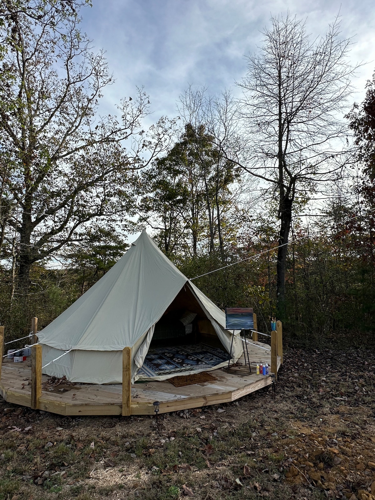 Terhubung kembali dengan alam di tempat liburan yang tak terlupakan ini. Tenda dinding 16x20 dengan dek pribadi 8 kaki. Perhatikan keindahan hutan seluas 44 hektar kami. Berjalan kaki sebentar ke pemandian yang dikendalikan iklim. Tenda yang dikontrol iklim dengan kipas angin langit - langit, kulkas min, pembuat kopi, tempat tidur berukuran king, dan 2 set tempat tidur susun ukuran twin. Tempat duduk dek untuk 6 orang. Dengan meja bistro di dalamnya yang memiliki dua kursi.