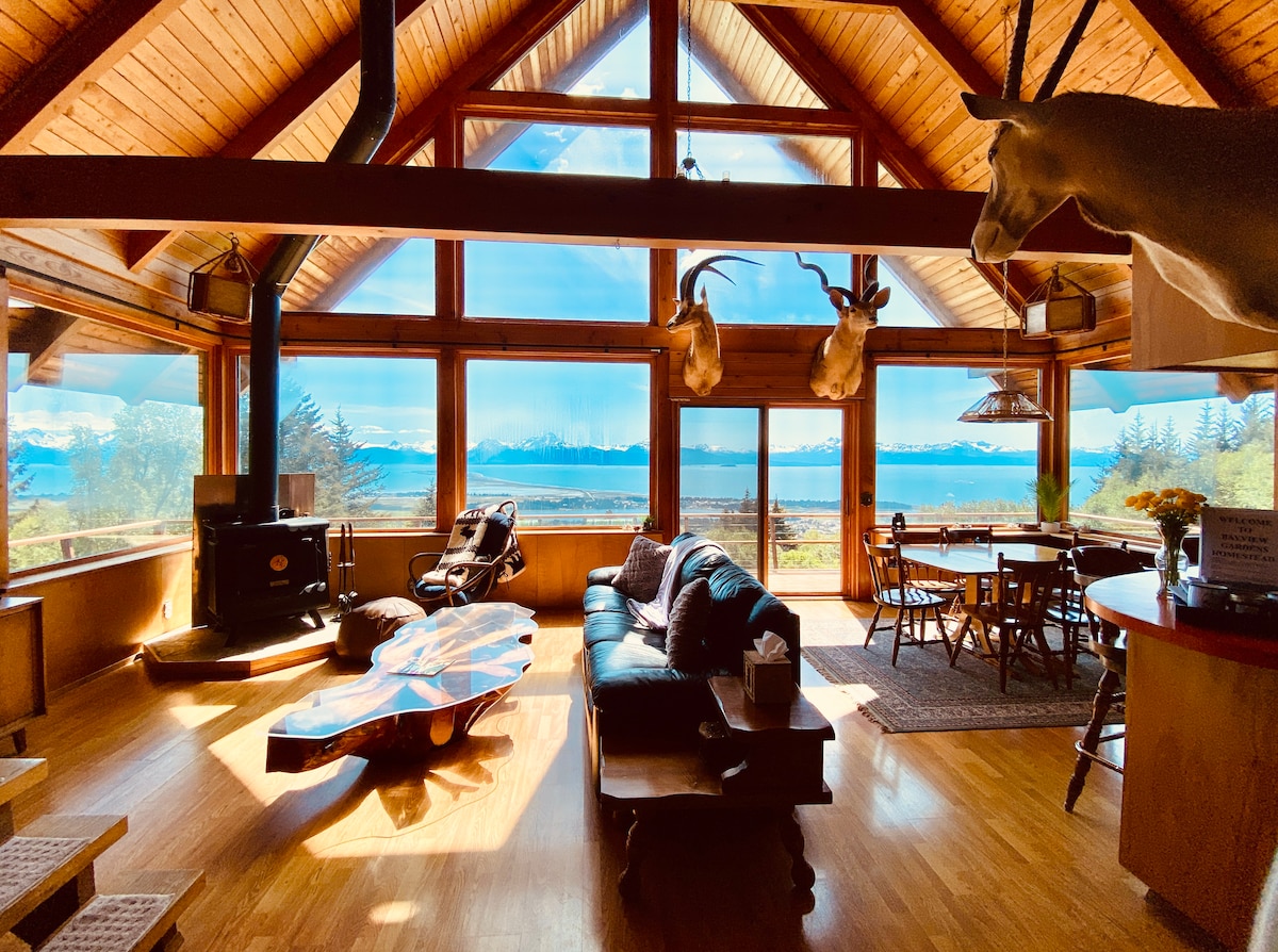 Wake up to the panoramic view of the Kachemak Bay & Grewingk Glacier from nearly every room in this gorgeous cabin. You can comfortably accommodate 12 guests, sip your coffee(or wine) from the deck, indulge in a sauna, or gather around the firepit at your leisure. Located just 10 minutes to the heart of Homer where you can embark a fishing charter or water taxi to hike the glacier. Shop and dine at the local favorites, or beach-comb along the Homer Spit and Bishop's Beach. Book your stay now!