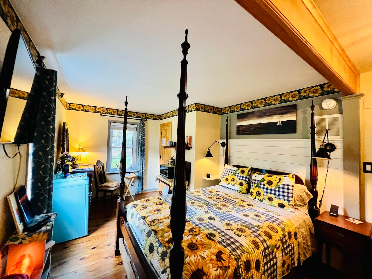 Enjoy private entry, peaceful, 3 blocks to Downtown Mall. 2nd floor suite, wood floor, 1 queen bed, sofa, electric fireplace, study/desk-remote work, double bathroom-step-in shower, 4' clawfoot tub. Private coffee room/library: compact refrigerator, microwave, ceramic cookware, full dish set, flatware, wineglasses, electric kettle, pour-over coffee Chemex, locally ground coffee, bakery breakfast bread, NO KITCHEN/no stove-Support local restaurants! By request:Extra bed for $35/night.