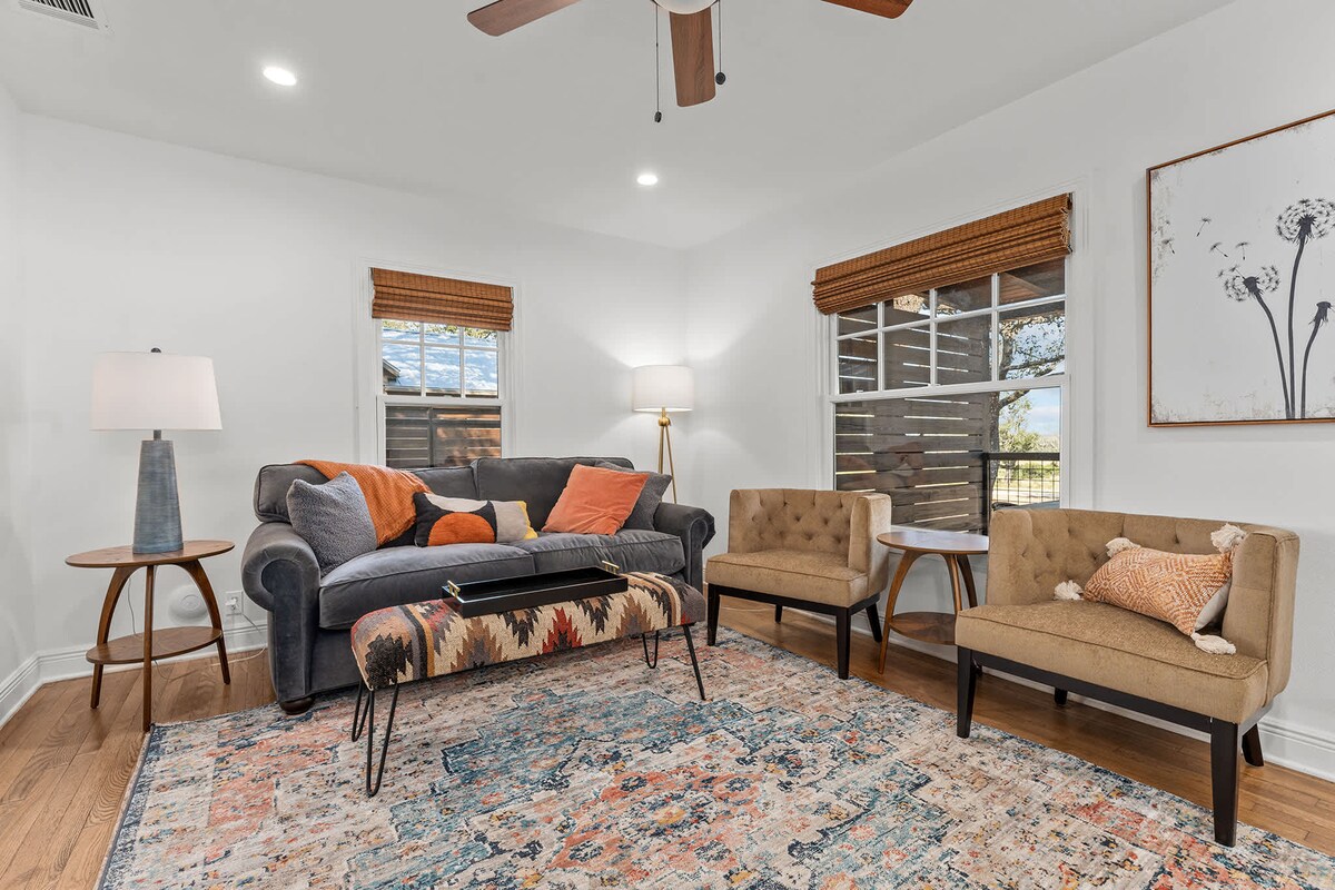 Selamat datang di Oak Haus di The Glades di koridor kilang anggur. Tenang saja di tempat liburan yang unik dan tenang ini. Nikmati anggur di lubang api atau kopi di teras, tempat rusa mungkin melintas. Luangkan waktu Anda untuk bersantai, bermain game, atau berenang di kolam koboi yang dipanaskan (yang merupakan tangki stok 10 kaki) di kandang rekreasi umum. Kunjungi 12 kilang anggur, kilang bir, atau dua penyulingan yang berjarak satu setengah mil dari Oak Haus. Fredericksburg dapat dicapai dengan berkendara sebentar saja.
