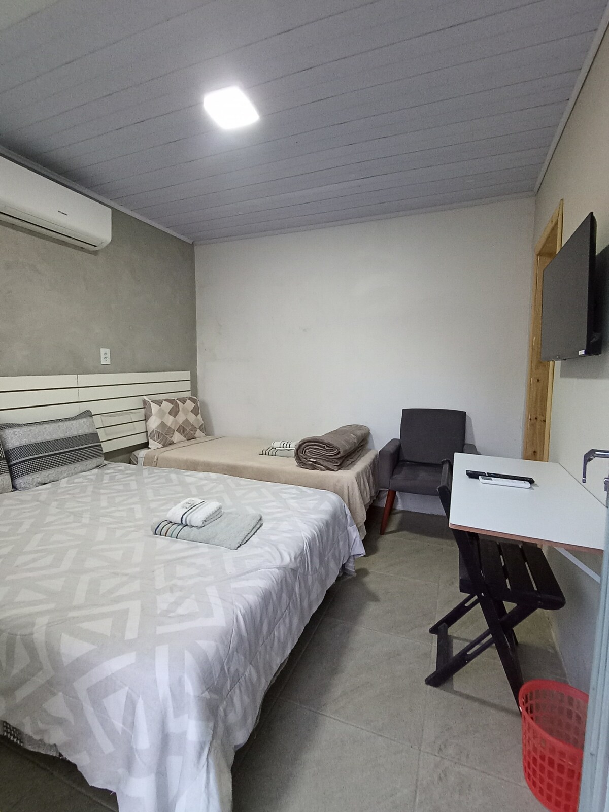 Apto bem localizado, próximo a mercados, restaurantes, lojas e praça central. Ambiente seguro com portão eletrônico. Quarto com ar condicionado frio/quente. Cozinha completa com torneira quente, chaleira elétrica, microondas, liquidificador e torradeira. Banheiro com box de vidro, ducha higiênica e secador de cabelos. Sala com ventilador de teto e smartv com Netflix e Sky com grade completa. Kit para chimarrão.