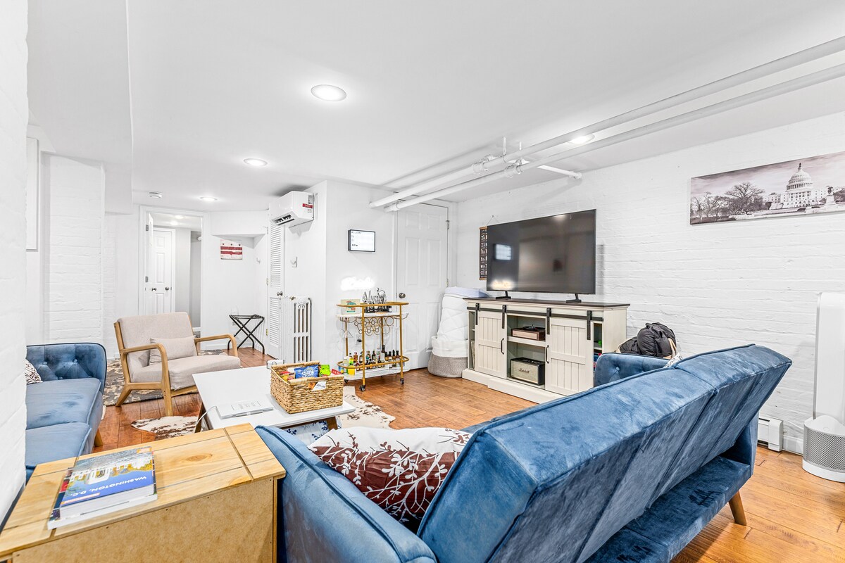 Basement Inggris 1 kamar tidur yang cerah di Bloomingdale dengan pintu masuk pribadi dan fasilitas lengkap. Menghadap ke Crispus Attucks Park. Set meja siap untuk bekerja dari rumah. Tempat tidur queen + 2 sofa tidur dengan bantalan kasur. Dapur lengkap, 2 smart tv, pemutar rekaman, bar lengkap, camilan, dan semua fasilitas dasar. Ramah hewan peliharaan! Unit AC baru yang ditingkatkan. Area pusat, ramah keluarga, area yang tenang. Berjalan kaki ke metro, Union Market, dan tempat makan lokal. Halaman belakang yang ramah anjing (bersama); Merokok di luar diperbolehkan.