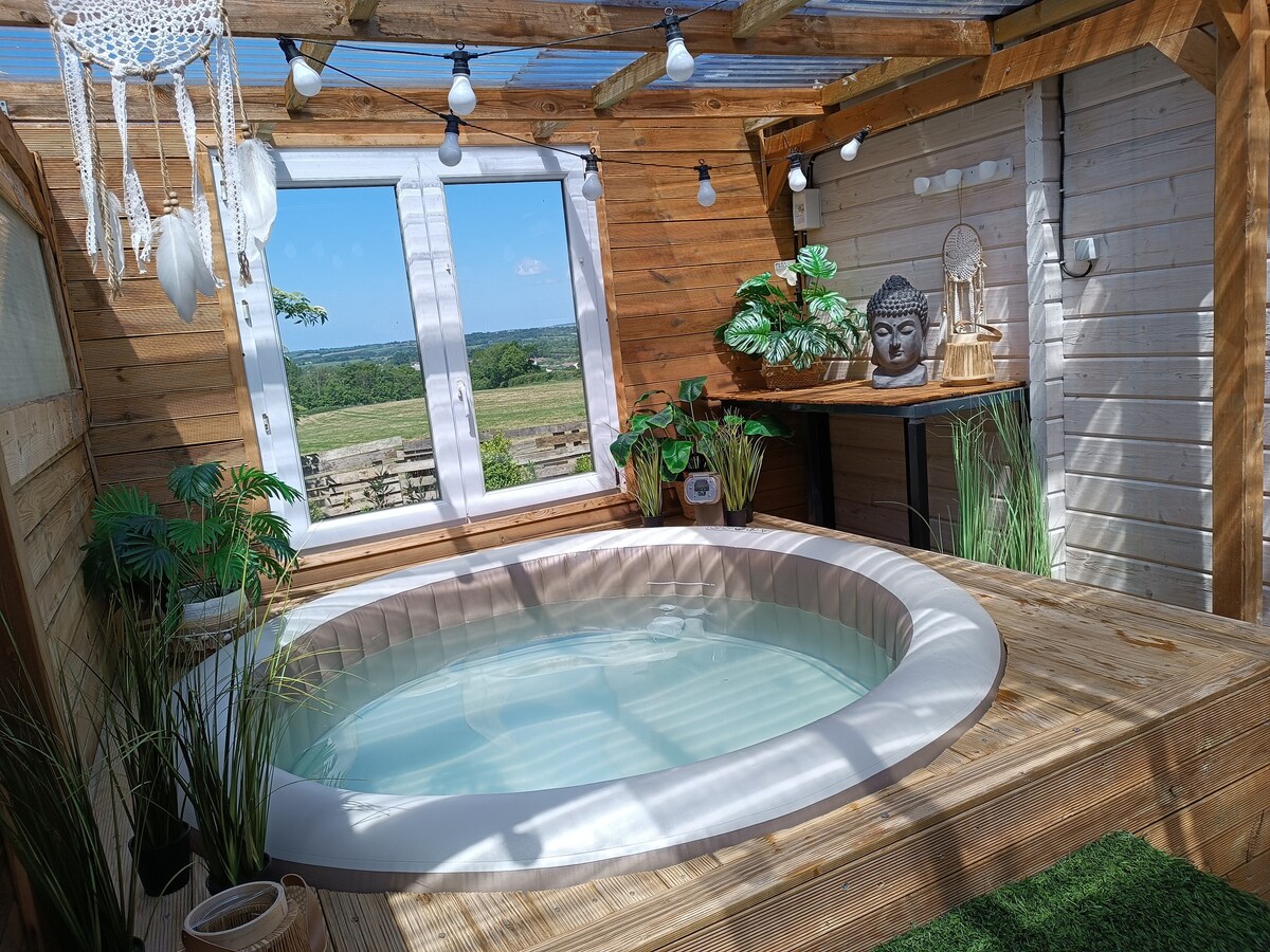 Terletak di lingkungan hijau dengan pemandangan pedesaan yang menakjubkan, bersantai di pondok kayu ek menikmati sauna dan jacuzzi pribadi, teras dan taman di mana Anda dapat melihat rusa, kelinci, dan hewan liar lainnya yang juga datang untuk beristirahat. Gite ini, di satu lantai, memiliki ruang tamu/ruang tamu, dengan dapur lengkap, kamar mandi, 1 kamar tidur dengan tempat tidur double dan 1 kamar tidur dengan 2 tempat tidur single.