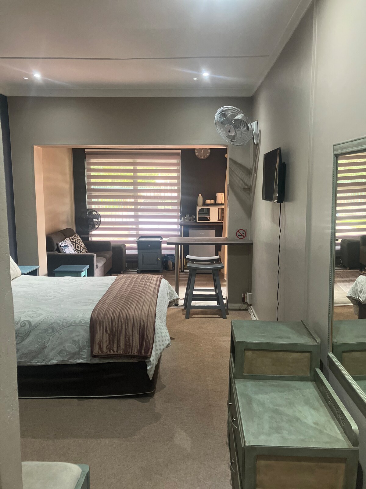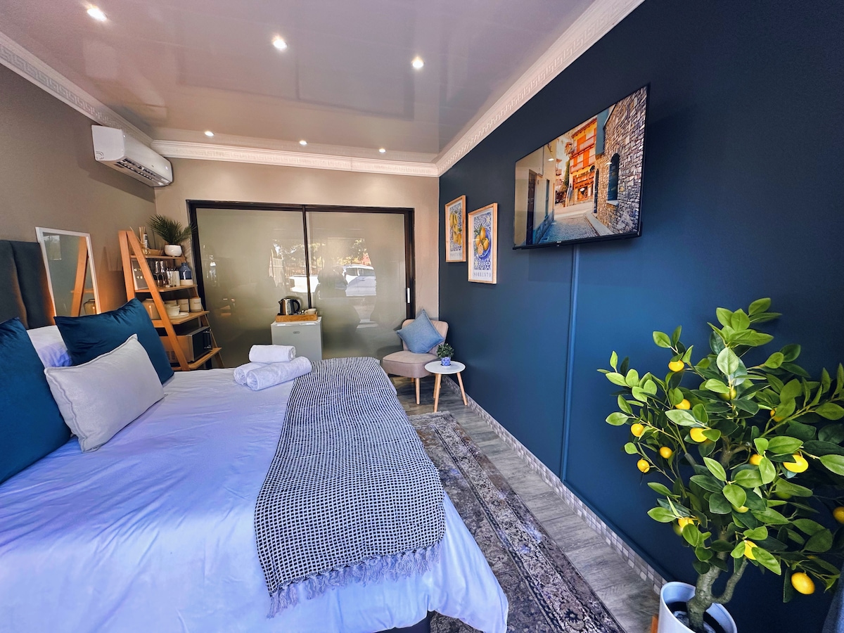 Studio Mewah ini memiliki tempat tidur berukuran queen dan kamar mandi dalam. Nikmati Wi-Fi, AC, dan smart TV dengan DStv dan Netflix. Dapur kecil yang dilengkapi dengan kompor gas, microwave, dan kulkas menambah kenyamanan masa inap Anda.