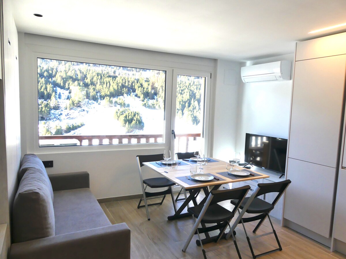 Studio ✨ nyaman untuk 4 tamu (2 orang dewasa + 2 anak - anak berusia hingga 12 tahun), direnovasi sepenuhnya dan dilengkapi dengan setiap detail. Cerah 🌞 dengan pemandangan menakjubkan di atas Incles Valley, antara Soldeu dan El Tarter (Grandvalira). Sangat cocok untuk memutuskan hubungan, menghirup udara segar, dan menikmati pegunungan.
