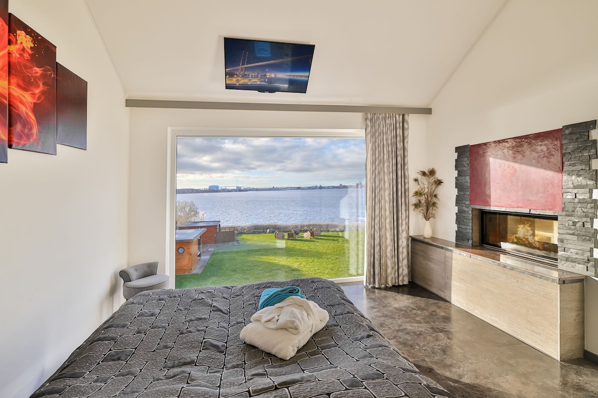 Luxusappartement Rungholt mit Wohnzimmer (78 qm), voll ausgestatteter Küche, Kochinsel mit Tresenbereich, separater Essplatz, Panoramafenster, Kamin, Wohnlandschaft, 2 Schlafzimmer mit Doppelbett bzw. -couch, Bad mit sep. WC, Dusche, Badewanne für 2 Personen, separater Flur mit Garderobe, Terrasse (30 qm) im Garten, Seeseite, Südlage, Terrassenmöbel, Sonnenliegen, Grill, Strandkorb.
