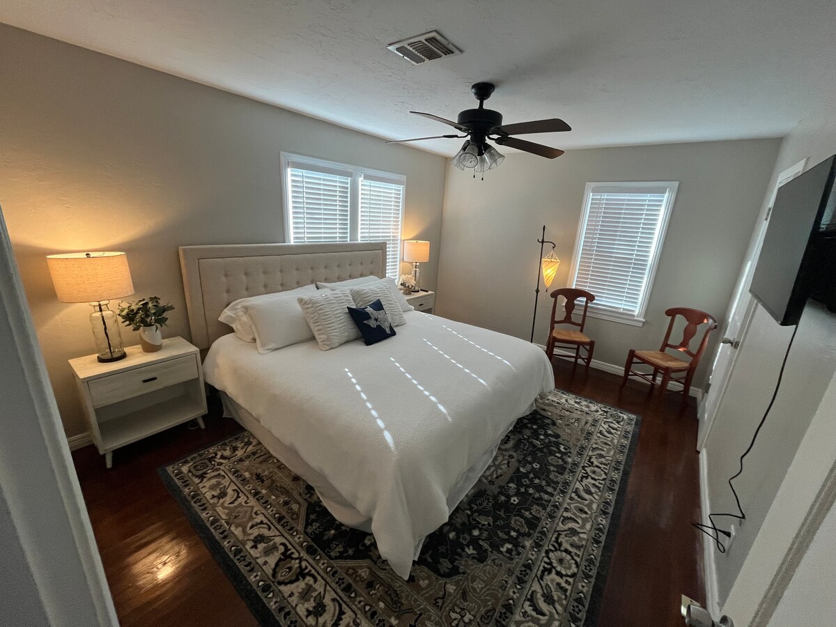 Nikmati pengalaman bergaya di tempat yang berlokasi di pusat kota ini. Nyalakan pemanggang barbekyu di patio belakang pondok yang direnovasi total ini. Bangun dengan perasaan segar di rumah kami yang nyaman dan menampilkan dapur modern, perabot kontemporer, dan halaman belakang pribadi. 1 kamar tidur dengan tempat tidur king dan 1 kamar tidur dengan tempat tidur queen. Nikmati wifi gratis & aplikasi streaming gratis kami seperti Disney+, ESPN & HULU!