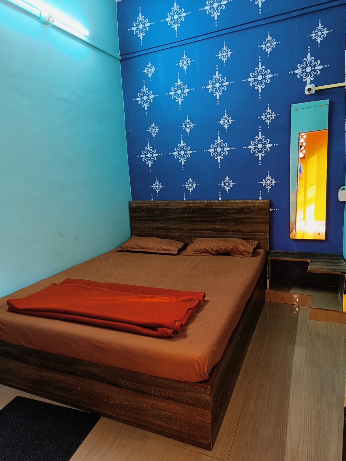 Simple, private, non-AC and comfortable room at Kamat Homes, suitable for up to 3 guests. Ideal for solo travelers, families, students, and backpackers seeking a peaceful, budget stay. The room includes a double bed with clean mattress, fresh bedsheet, pillows and blanket, good ventilation, window, side table, chair, and charging point. Private attached wash area with washbasin and bathing space. Quiet, clean, and homely atmosphere.