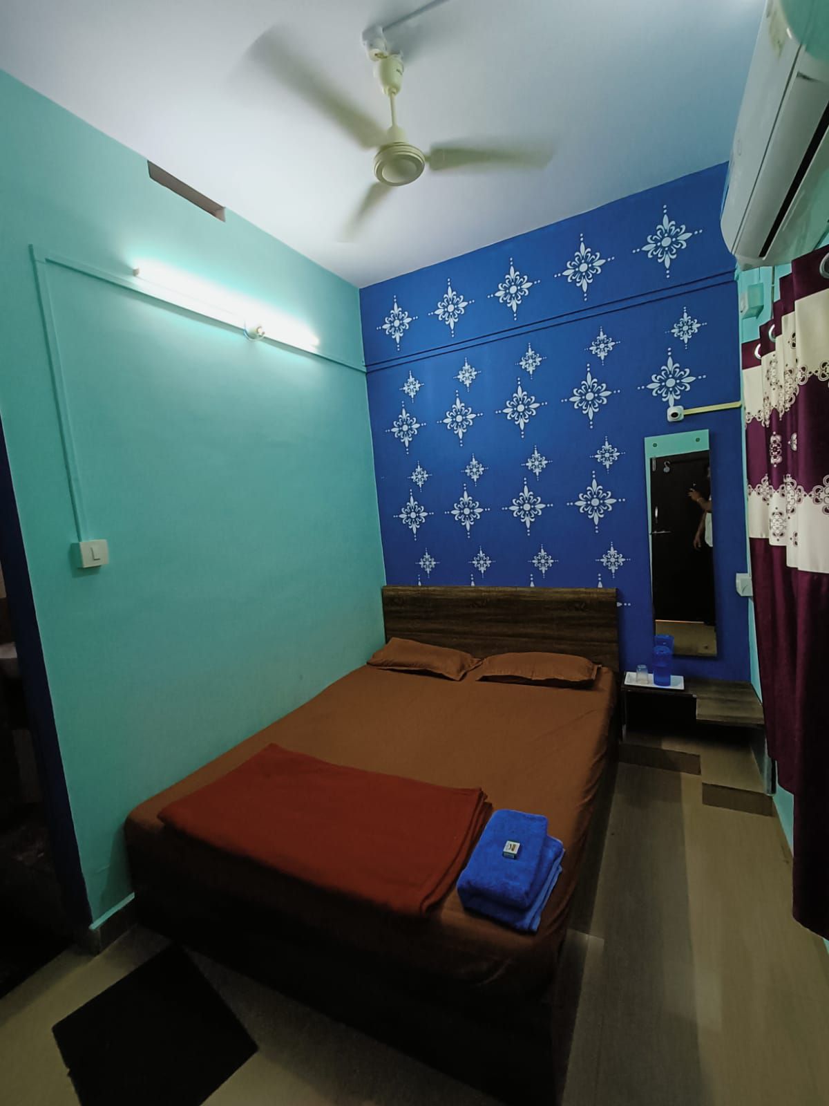 Simple, private, non-AC and comfortable room at Kamat Homes, suitable for up to 3 guests. Ideal for solo travelers, families, students, and backpackers seeking a peaceful, budget stay. The room includes a double bed with clean mattress, fresh bedsheet, pillows and blanket, good ventilation, window, side table, chair, and charging point. Private attached wash area with washbasin and bathing space. Quiet, clean, and homely atmosphere.
