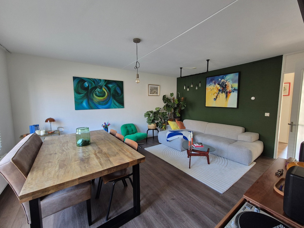 Apartemen bergaya, unik dan tenang (74m2) dengan teras atap + perapian dengan banyak cahaya matahari alami dekat dengan Vondelpark! Kesempatan unik untuk merasakan pengalaman terbaik yang ditawarkan Amsterdam seperti Vondelpark, area Oud West dan South, serta banyak restoran dan bar di tikungan. Tepat di sebelah halte trem jalur 1 dan supermarket. Di lantai 4 (tanpa lift) dan tidak ada suara berisik dari tetangga karena lantai teratas. Akses ke teras atap unik tempat Anda bisa menyaksikan matahari terbit hingga matahari terbenam!