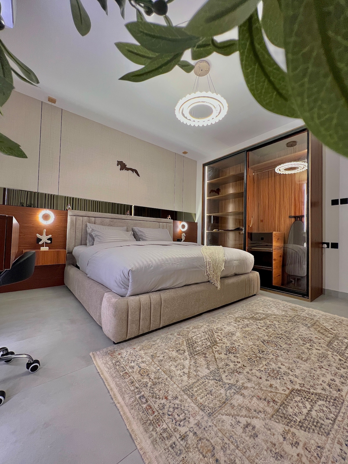 Explore a lavish getaway in the heart of Al Mugharazat district, a sought-after area in Riyadh. Our exclusive unit is just a 5-minute stroll from Al Nakheel Mall, which has a cinema, numerous dining options, cafes, and global brands.