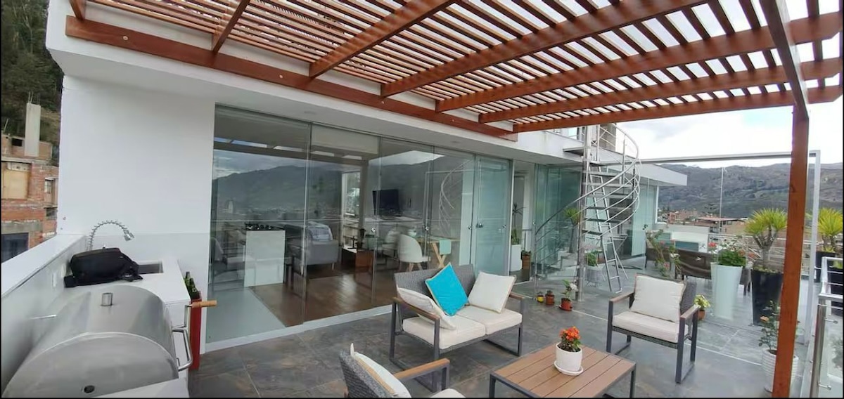 Apartemen Andean yang modern dan indah dengan dua kamar tidur, dua kamar mandi, balkon menghadap pegunungan bersalju, serta tempat berjemur untuk mengagumi pemandangan kota dan pegunungan putih