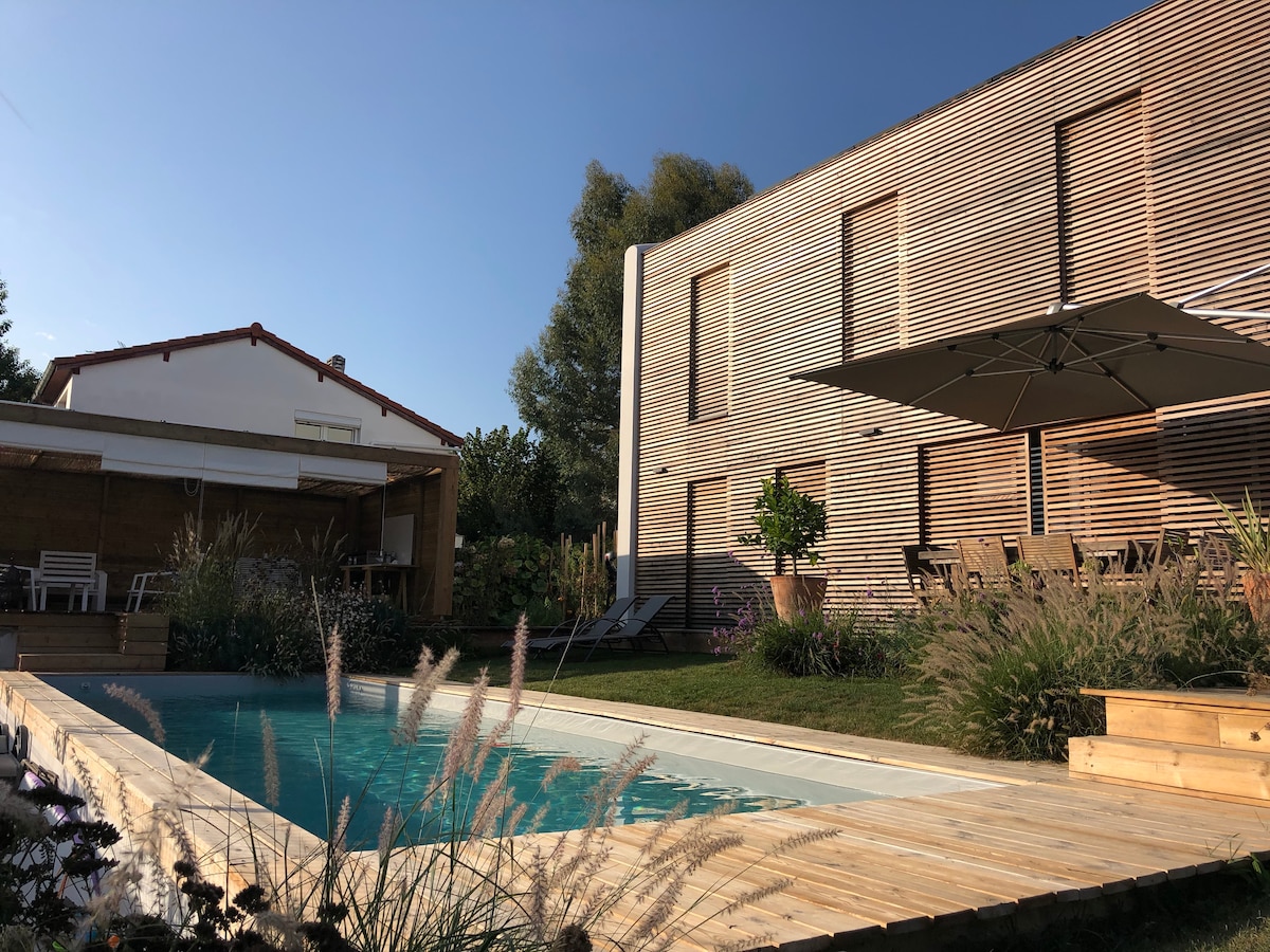 Charmante maison 1924 rénovée par architecte, décoration contemporaine, jardin paysager, piscine chauffée(sels)en saison et en fonction de la météo. - RDC: véranda/salon, cuisine sur salle à manger, salon. Chambre 1 lit 160x200cm avec salle d'eau ouverte et wc séparé. - R+1: salon, chambre n°2, vélux, 1 lit 160x200cm. -chambre n°3, 1 lit 160x200cm. -1 salle d'eau avec wc et buanderie. - Terrasse avec table à manger, salon et parasol. Douche extérieure avec eau chaude, plancha Gaz