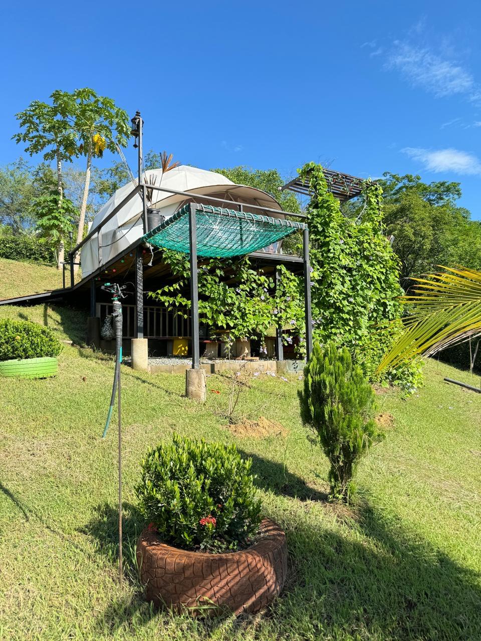 Glamping con Hermosa Vista Es un espacio de más de 900m2 solo para ti rodeado de naturaleza y arboles excelente ubicación A 40 min de la ciudad de Medellín 20 min del aeropuerto 50 min del peñol-guatape Completamente dotado Cafetera (cafe y aromatica incluida) Jacuzzi con agua caliente Baño privado Domo de 25 m2 Zona BBQ Fogata Ducha al aire libre Malla catamarán de 3x3m Parqueadero Contamos con un mayordomo las 24 horas horarios de check-in y check-out FLEXIBLES segun disponibilidad