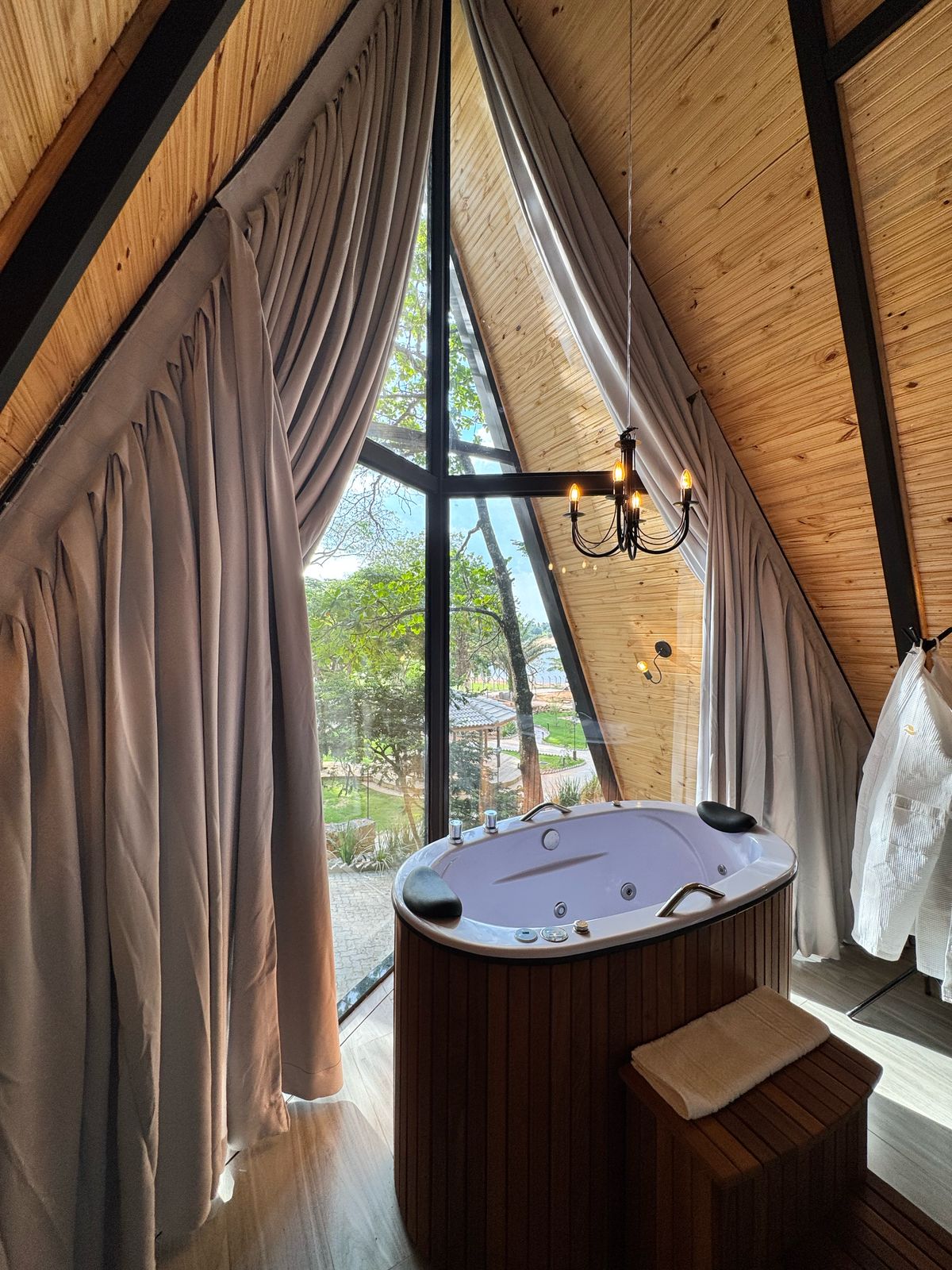 Localizado a 3 km da cidade, nosso chalé é o refúgio ideal para quem busca paz, conforto e sofisticação. Com vista deslumbrante para o campo e teto de vidro, você pode admirar as estrelas sem sair da cama. O chalé conta com ar-condicionado, frigobar, TV e cama queen, além de banheiro e cozinha completa na área externa. Para momentos de lazer, dispõe de sala de jogos e hidro ao ar livre. Para completar, um lago com pedalinho para momentos de tranquilidade. Venha viver dias únicos na natureza!