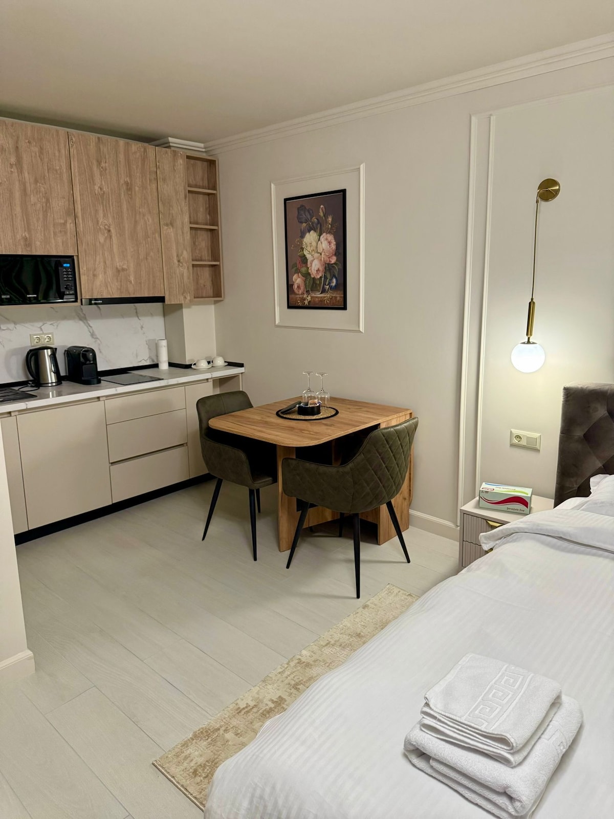 Studio sentral dengan teras luar yang terdiri dari lorong, kamar mandi dengan bak mandi dan dapur dengan kamar tidur yang lengkap dan berperabot. Teh dan kopi untuk tamu. Smart tv Microwave Cumptor Akses ketel air dengan interkom. Dilarang merokok. Kabel. Wifi gratis Check - out 10 Check in -14 Saya tidak menyetujui hewan peliharaan. Merokok di teras luar. Check - in mandiri. Parkir Zona B