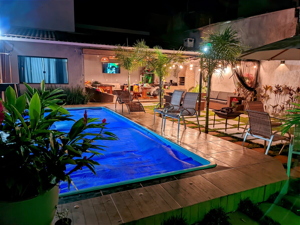 RUMAH CHARM DO CERRADO sangat indah, dekat dengan pusat kota, nyaman dan akrab, memiliki 3 kamar tidur, satu suite dan semua dengan AC, 1 tempat tidur double, satu tempat tidur single, seprai dan handuk mandi lengkap, macaw, maleiros, dan tirai gelap. Sala com smart tv,,Sky, Netflix e wi-fi; Dapur lengkap; Lavabo; Area santai dengan barbeku, freezer, kolam renang yang dipanaskan (solar), air terjun dan lounger; Redário; Garasi untuk 3 mobil.