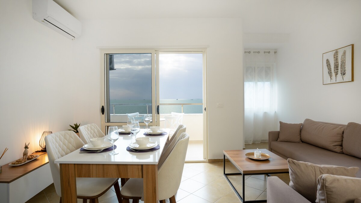 The apartment is located 10meters from the sea and in the best beach area of Durres With its stylish accommodation, big balcony and amazing view you are guaranteed to enjoy your holiday and get the best experience from Durres beach The apartment is fully equipped for short stay and long stay accommodation The apartment is located on the 4th floor of the building which is in the most exclusive first line area