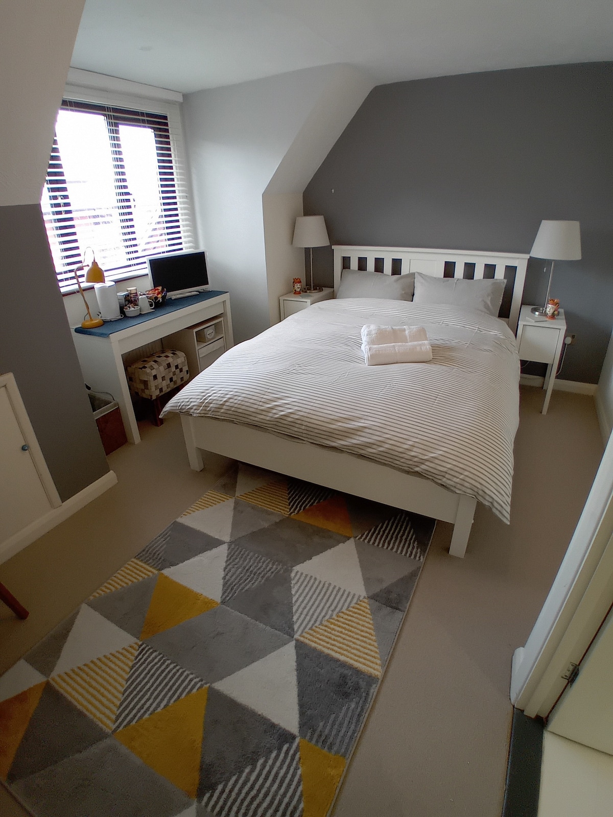 Newly refurbished studio flat with driveway parking, close to Guildford town centre. King size bed, fitted kitchen with oven/microwave, fridge, Nespresso machine, smart tv and bathroom with power shower. We are located about in a very quiet area, yet just a few minutes drive away from Guildford town centre. Our garden borders the North Downs way so great for walkers. Private entrance (up a flight of stairs), and parking behind electric gates. Milk, tea coffee etc, and anything else you require.