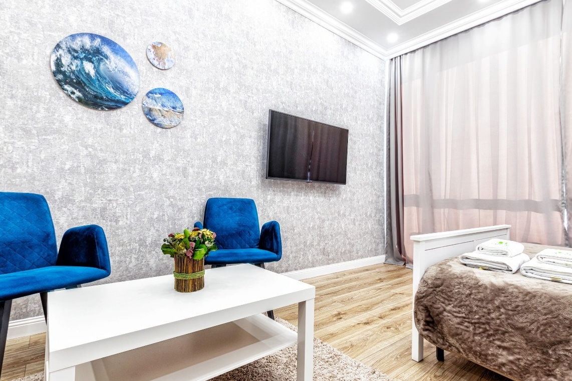 Apartemen modern dan nyaman di Astana. Kami dengan senang hati menawarkan Anda untuk menghabiskan waktu Anda dengan nyaman dan merasa seperti di rumah. Di semua apartemen, kami mencoba mempertahankan satu gaya, yang menciptakan kenyamanan tertentu bagi tamu kami. Di apartemen Anda bisa menemukan semua yang Anda butuhkan untuk memasak, Internet berkecepatan tinggi (WI FI), SMART TV