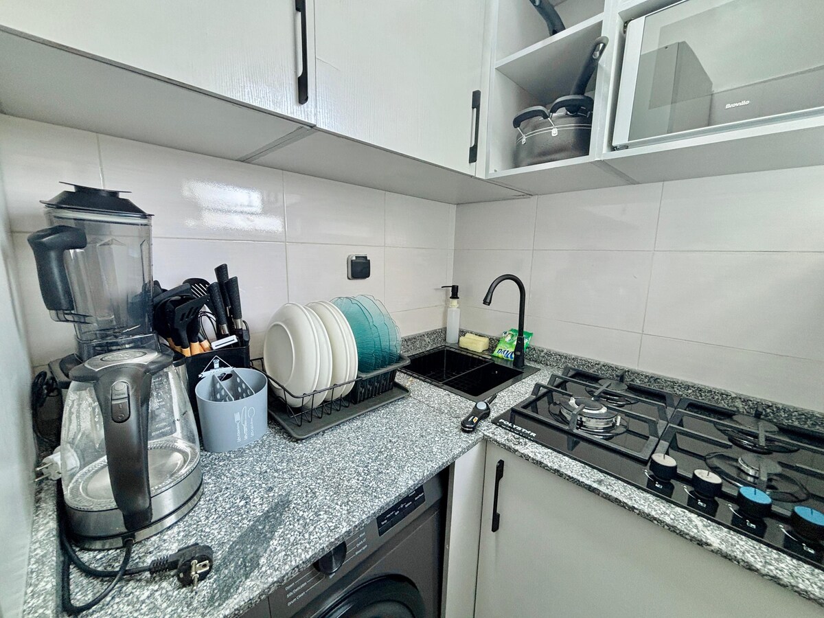 Anda akan menghargai ruang tamu yang indah dan didekorasi dengan apik dengan dapur terbuka yang lengkap. Kamar tidur ini memiliki tempat tidur berukuran Queen dan shower en - suite. Apartemen dilengkapi dengan: ✅ Pendingin udara & kipas angin Dapur (Microwave, Mesin kopi, Kompor, Pemanas air, Blender, Kulkas, Penanak nasi, Freezer, dll.) ✅ Ruang tamu dengan TV, meja makan menghadap balkon. ✅ Parkir tersedia ✅ Mesin cuci Wi - Fi ✅ gratis (internet tersedia)