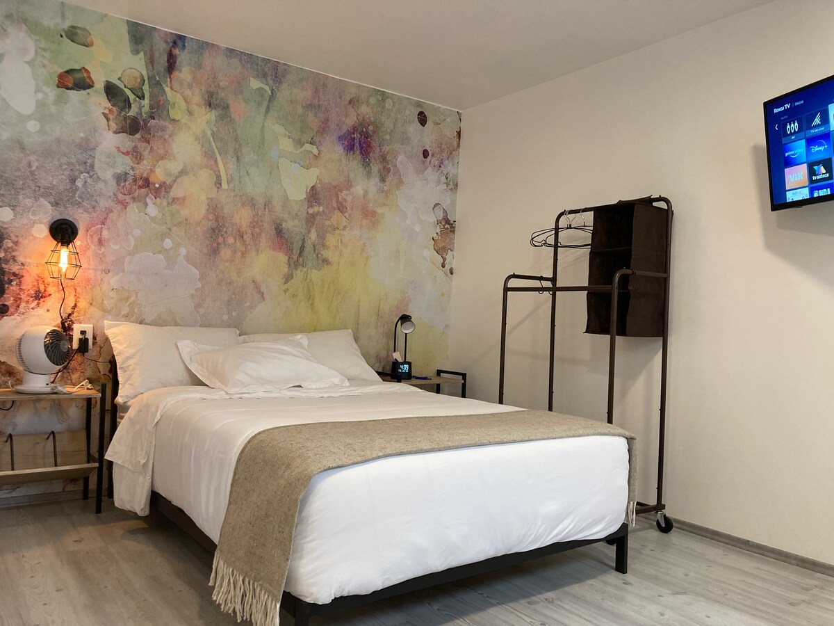 CAMILA adalah studio yang dirancang dengan cermat di pusat La Condesa. Kombo CDMX yang langka: teras pribadi, AC yang kuat untuk hari yang hangat, dan Wi-Fi yang cepat. Di dalam, Anda akan menemukan kamar tidur yang terinspirasi oleh Warhol, area tamu yang nyaman, dan fasilitas dasar berkualitas yang membuat masa inap terasa mudah sejak Anda tiba. Kunjungi kafe, taman, dan restoran - lalu kembali ke rumah Anda yang tenang dan bergaya.