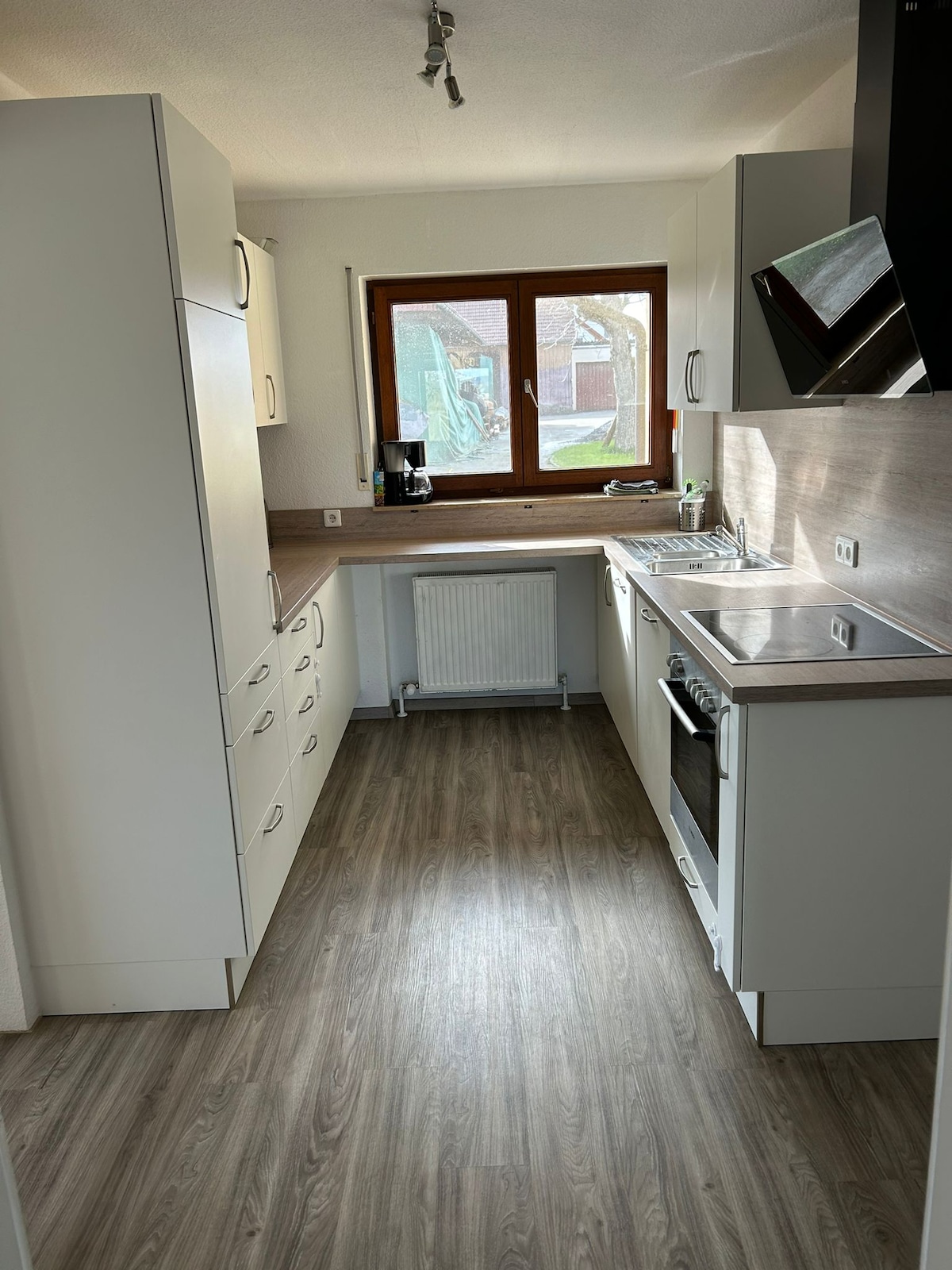 FeWo (120 m²), 4-Zimmer-Wohnung in ehemaligem Bauernhof (Einzelgehöft) an den Ausläufern des Naturparks Schwäbisch-Fränkischer-Wald, umgeben von Wiesen und Wäldern. Beschreibung: Große 4-Zimmer-Wohnung, im Erdgeschoß, separater Eingang - drei Stufen, Zentralheizung - 1 Einzel-, 2 Doppelzimmer, - große Wohnküche , Geschirrspülmaschine, E-Herd, Mikrowelle, Kaffeemaschine, Toaster, Waschmaschine, Kühlschrank - Wohn-/Esszimmer mit TV
