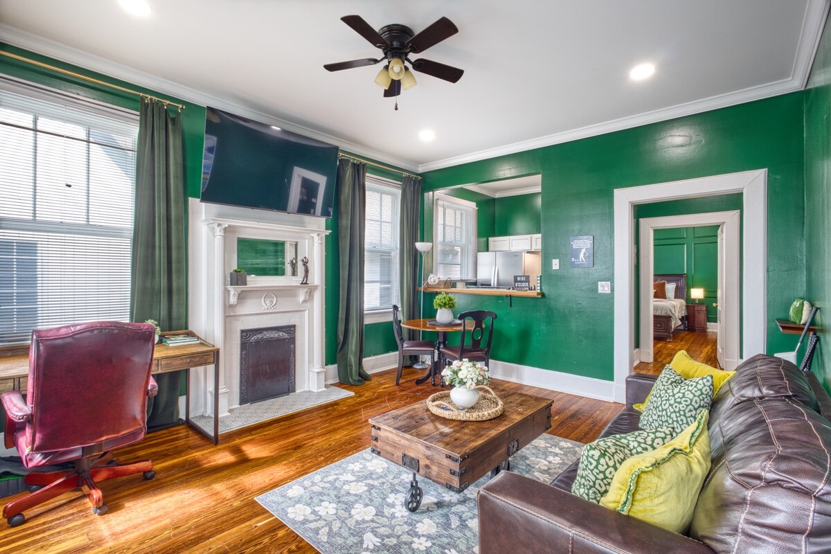Located in the heart of downtown Augusta!!! Enjoy tall ceilings and historic charm in a fully renovated private studio apartment. You will have your own full kitchen and private bathroom on this ground floor unit. 65 inch smart tv. Walk to all of downtown Augusta's best restaurants and bars. 4.5 miles to the Masters golf Course. 1.5 miles to the medical district and 20 minutes to Fort Gordon. Have a large group? There are six units in this building, each capable of sleeping 4.
