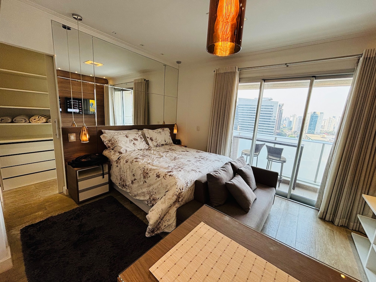 Studio modern, pemandangan indah, didekorasi dengan baik dengan balkon, dapur lengkap, minibar, satu set seprai lengkap. Lantai tinggi. Internet 250 megas, smart TV, AC dan shower higienis. Lokasi yang luar biasa, dekat dengan pusat perbelanjaan JK Iguatemi dan Vila Olímpia, Hípica Paulista dan Insper, FMU dan universitas Anhembi-Morumbi. 1 tempat parkir. Building with fitness center, solarium , bicycles available , swimming pool , laundry room, coworking space, mini autonomous market. Nilai check - out untuk 3 tamu