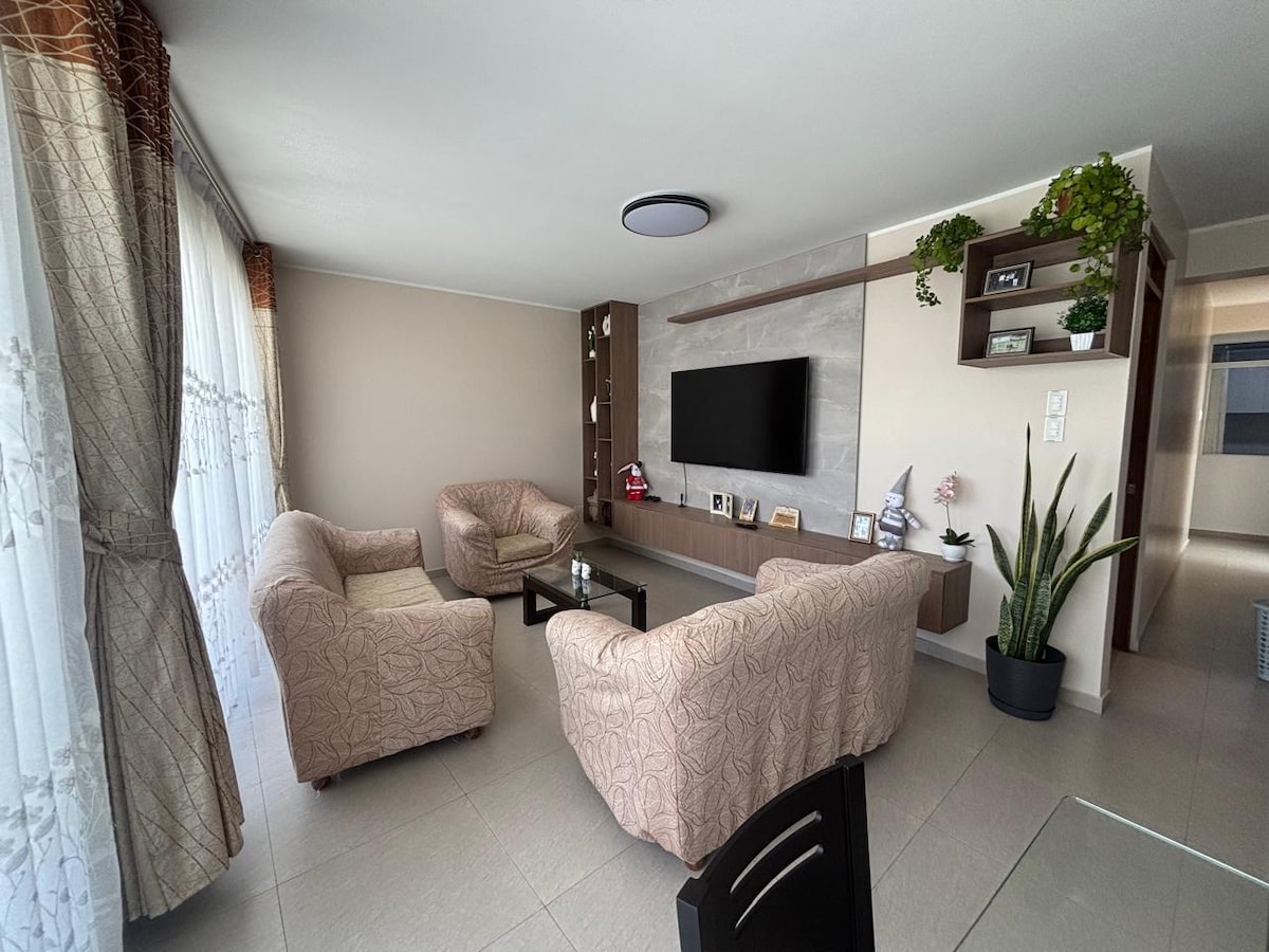 Rasakan kenyamanan rumah di apartemen yang lucu ini. Terletak di Residencial Las Dalias, dekat Alameda Valdelirios. 1,3 km dari Main Plaza 3,0 km dari Bandara Alfredo Mendivil. A 4.3km del Terminal de Buses - Plaza Wari. Kamar utama dan sekunder memiliki TV (Silver: Netflix, HBO, Prime, dan Amazon). Kamar tidur utama memiliki kamar mandi pribadi dan air panas. Terdapat garasi pintu masuk independen di kawasan perumahan yang sama.