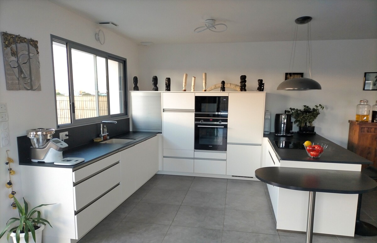Rumah yang indah dan tenang di hypercenter, modern dan autentik, di mana anak muda dan tua akan menemukan kebahagiaan mereka (sepak bola meja, trampolin, tenis meja...). Ini adalah rumah keluarga kami, tempat kami sesekali bertemu dengan keluarga dan teman. Kami mendesainnya seolah - olah kami tinggal di sana penuh waktu: tempat tidur berkualitas, dapur generasi terbaru, taman besar dengan teras di mana Anda dapat memilih antara bersantai di kursi dek dan aktivitas yang tersedia.