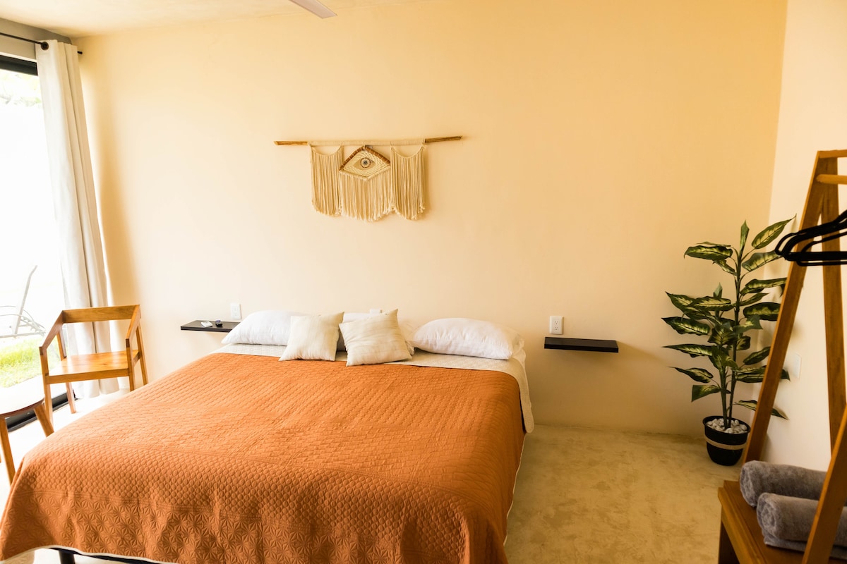 Ruang yang dirancang untuk terhubung, bersantai, dan menciptakan kenangan. Studio yang nyaman dan lengkap ini cocok untuk pasangan yang mencari liburan yang damai atau keluarga yang menikmati waktu bersama di Bacalar. Awali pagi Anda dengan kopi segar, nikmati sore hari bermain permainan papan, dan bersantai di ruang yang nyaman dengan dapur fungsional, area tamu, TV, kamar mandi pribadi, dan lemari pakaian. Atapnya adalah yang paling menonjol: tempat duduk santai untuk menyaksikan matahari terbenam dan kolam renang yang menyegarkan untuk bersantai saat hari berakhir.