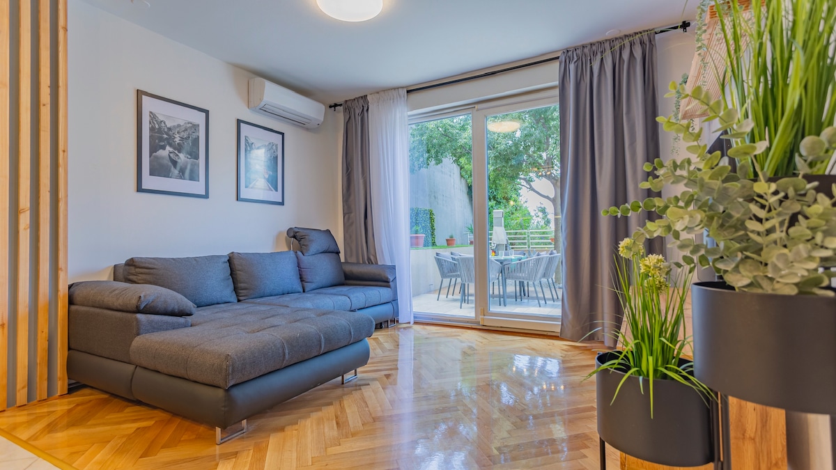 Apartemen ini menawarkan dua kamar tidur kepada tamunya, yang masing - masing memiliki kamar mandi, teras pribadi dengan taman kecil, dapur dengan ruang makan, dan ruang tamu yang luas dengan pemandangan promenade dan pusat kota yang menakjubkan. Di teras pribadi, Anda mendapatkan bak mandi air panas. Tempat ini tersedia untuk digunakan sepanjang tahun. Apartemen terletak kurang dari seratus meter dari promenade dan taman - hutan Marjan yang indah. Fasilitas yang berbeda terletak di dekatnya, dalam radius sekitar 10 menit dengan berjalan kaki.