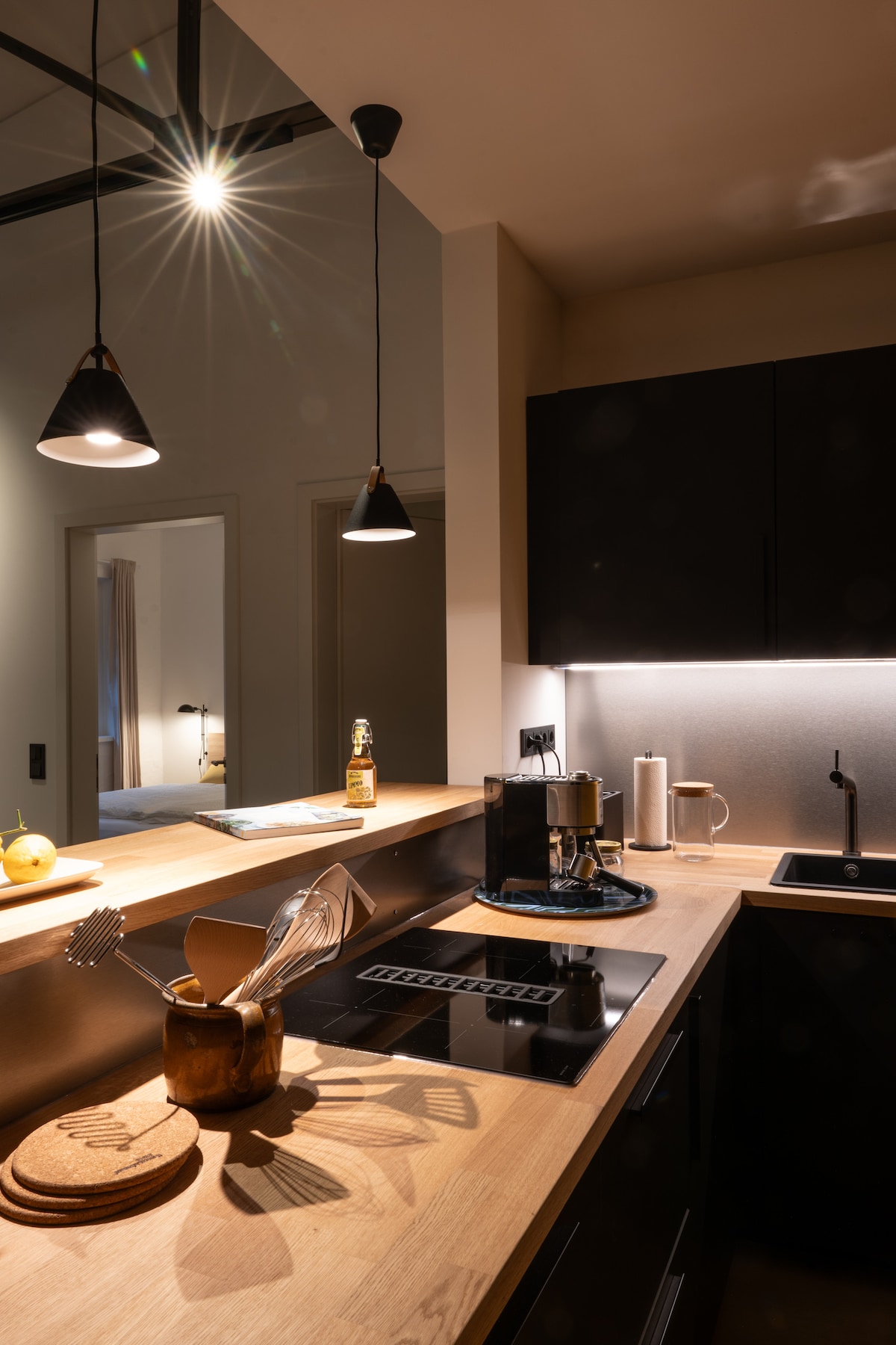 Kamar ini memiliki pintu masuk tersendiri yang terpisah dan terletak di ruang bawah tanah. Sebuah lorong kecil (yang hanya digunakan oleh tamu) mengarah ke kamar. Kamar ini bersebelahan dengan kamar mandi pribadi dengan pancuran. Sebagai pilihan (berbayar) sauna dapat digunakan. Tersedia WiFi. Kulkas dan microwave serta ketel listrik tersedia untuk digunakan. Sepeda dan sepeda motor dapat disimpan dengan aman di garasi.